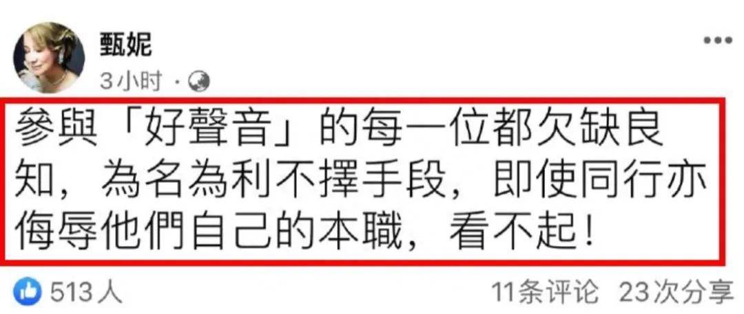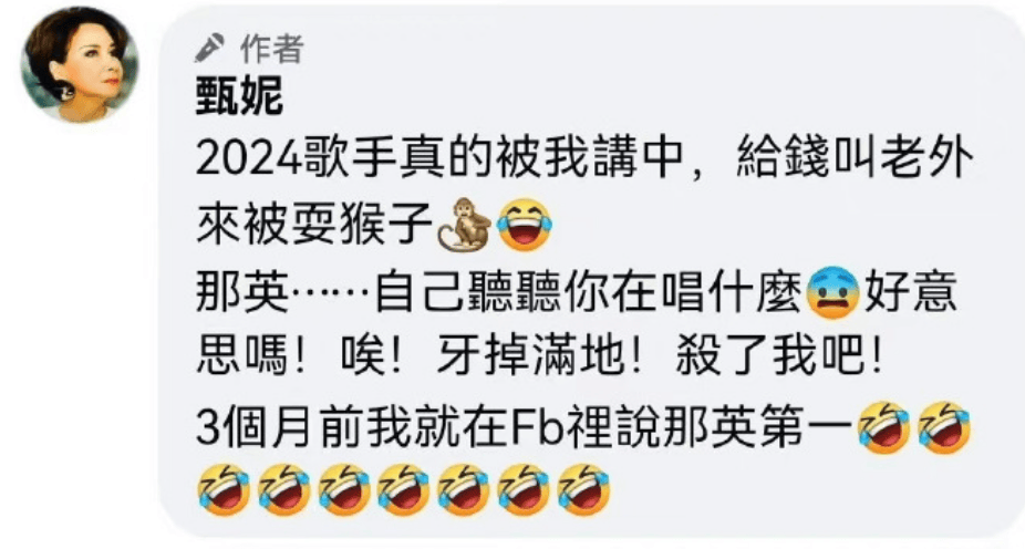 而就在比赛结果出来后,港圈殿堂级歌后甄妮也在社交平台发布了对这次《歌手》结果的看法,她毫不客气质疑那英的实力,质问那英好意思拿“歌王”吗?不看看自己唱的什么样子,牙掉满地。