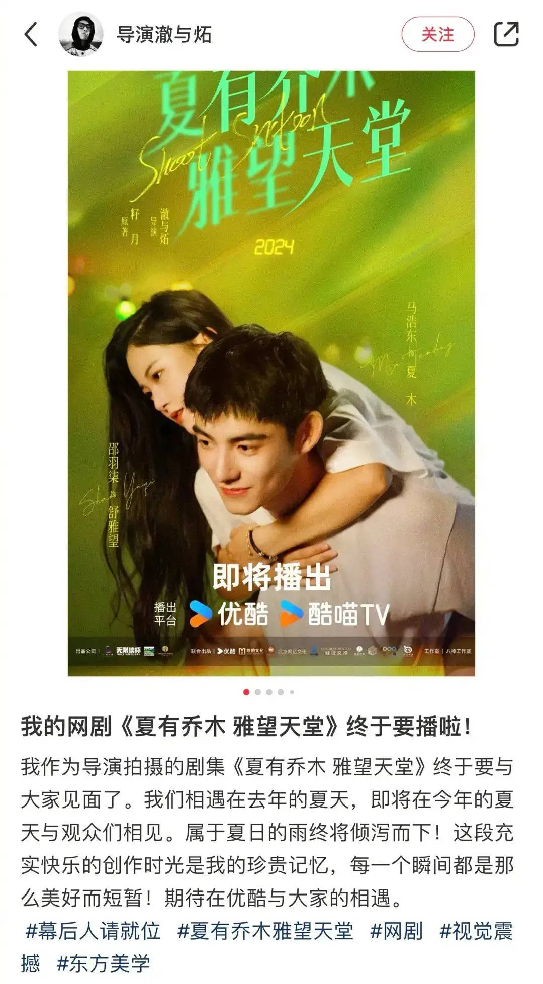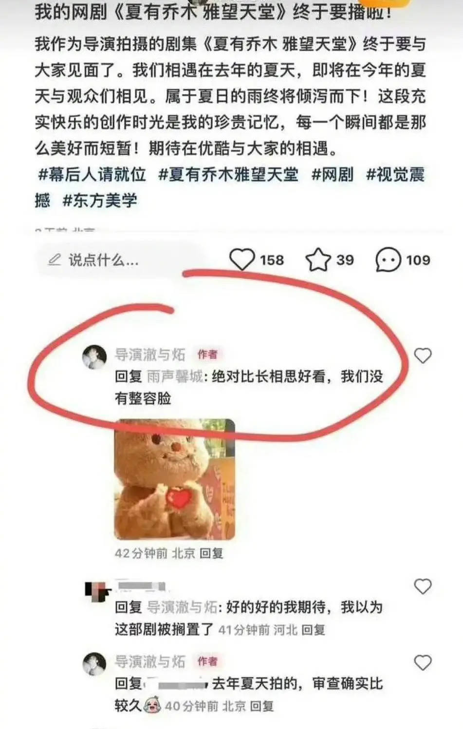 搜狐娱乐讯 7月29日,导演澈与炻在社交平台宣布网剧《夏有乔木雅望天堂》即将播出,同时他还在评论强调:这剧绝对比《长相思》好看,我们没有整容脸。导演的一番言论被指内涵《长相思》里的演员,不少网友纷纷开始热议。