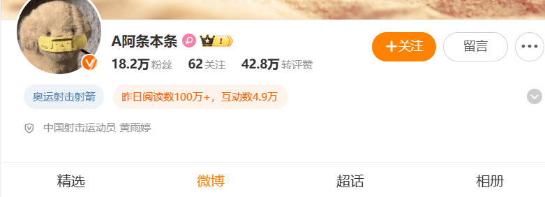黄玉婷叫@A阿条本条,头像是个可爱狗狗;