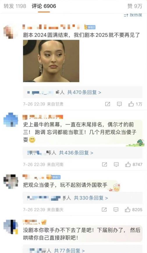 据了解,网络上有许多吐槽《歌手2024》有黑幕的声音,有网友更是直言:“史上最牛的黑幕,一直在末尾排名,偶尔才到前三!跑调、忘词都能当歌王!几个月把观众当傻子耍。”