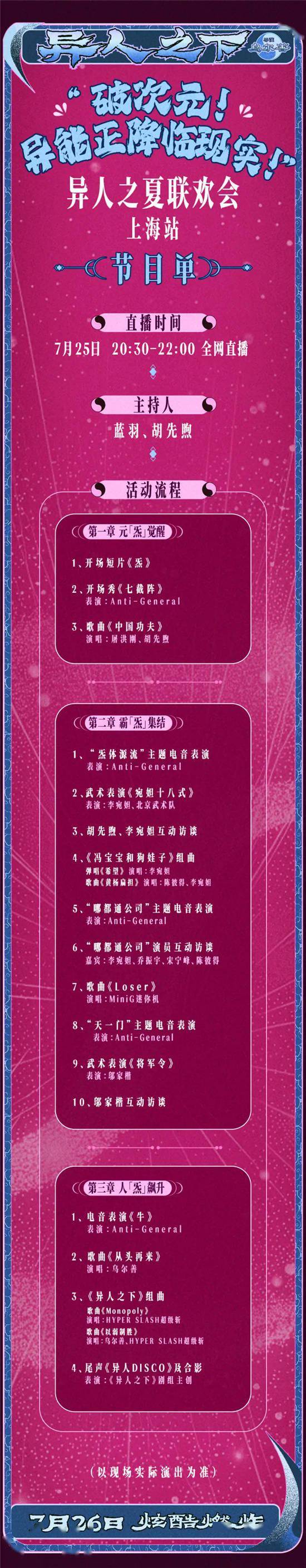 7月25日,电影频道“电影的夏天”直播季特别推出《异人之下》路演日志暨“异人之夏”联欢会上海站融媒体直播活动,以又一场盛大联欢及多场路演现场,正式书写属于“异人”们的路演日志。