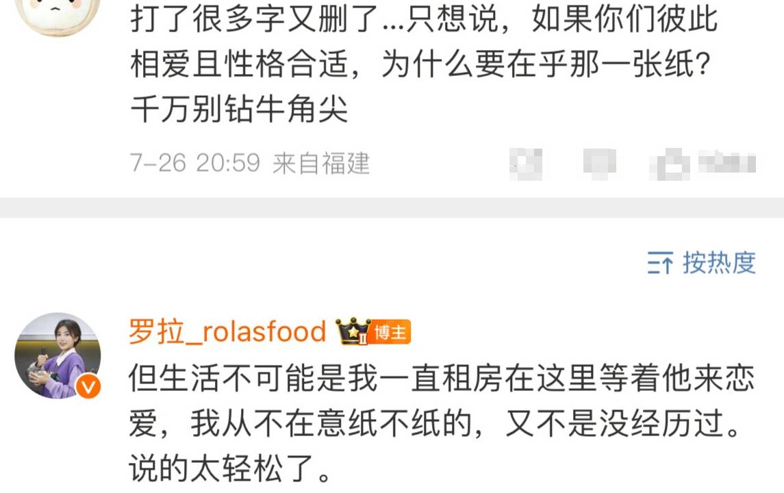 评论区有网友留言问道:“为什么要在乎那张纸?”对此,罗拉回复称:“但生活不可能是我一直租房在这里等着他来恋爱。我从不在意纸不纸的,又不是没经历过。说的太轻松了。”