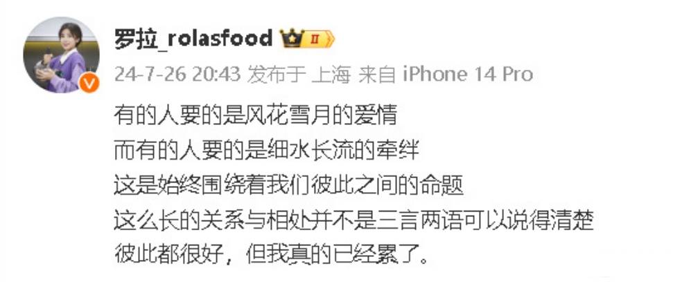 搜狐娱乐讯 近日,网传恋综cp罗拉与王能能分手,引发热议。王能能直播称两人只是吵架。26日,罗拉发文回应此事:“有人要的是风花雪月的爱情,而有的人要的是细水长流的牵绊。这是始终围绕着我们彼此之间的命题,这么长的关系与相处并不是三言两语可以说得清楚。彼此都很好,但我真的已经累了。”