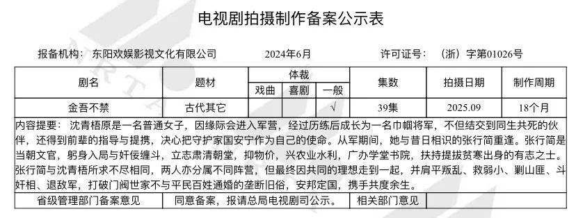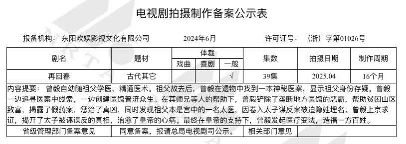 古装剧《再回春》由东阳欢娱影视文化有限公司备案,计划拍摄39集。