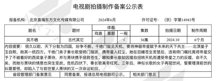 古装剧《凤不栖》根据作者天下归元的高人气小说《帝凰》改编,将由北京喜瑞东方文化传媒有限公司备案,计划拍摄36集。
