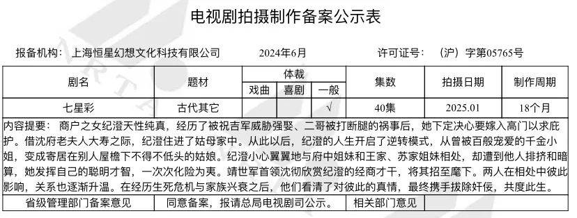 古装剧《七星彩》由上海恒星幻想文化科技有限公司备案,共40集,将由恒星引力、优酷出品。