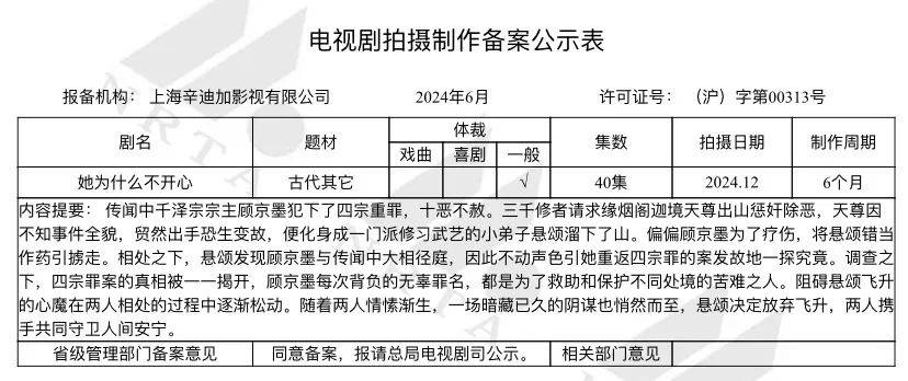 古装剧《她为什么不开心》改编自墨西柯的小说《魔尊她为什么不开心》,由上海辛迪加影视有限公司备案,共40集。