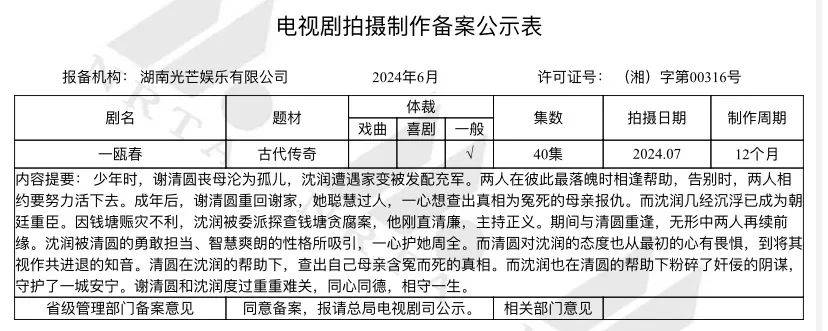 古装剧《一瓯春》根据尤四姐的同名小说改编,由湖南光芒娱乐有限公司备案,共40集。