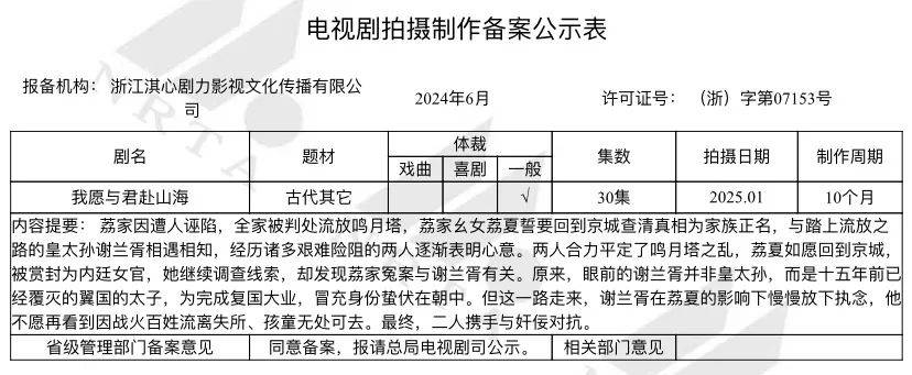 古装剧《我愿与君赴山海》根据匹萨娘子的小说《逐鸾》改编,由浙江淇心剧力影视文化传播有限公司备案,共30集。