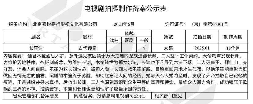 古装传奇剧《长笙诀》改编自九鹭非香的仙侠小说《司命》,由北京喜悦嘉行影视文化有限公司备案,共36集。