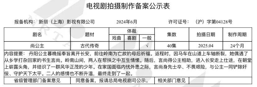 古装剧《尚公主》根据伊人睽睽的同名小说改编,由新丽(上海)影视有限公司备案,计划拍摄40集。