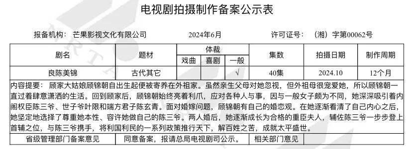 古装剧《良陈美锦》改编自沉香灰烬的同名小说,由芒果影视文化有限公司备案,计划10月拍摄,共40集。