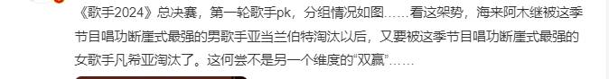 相比帮唱歌手的差距,总决赛的赛制才是观众担心的重点。据悉,《歌手》前几季也有两轮比拼,但是第一轮也是拉通排名,规定前几有进入第二轮的机会,这样每位歌手互相是对手,参照物一样,非常公平。但是令人意外的是,最新一季《歌手》总决赛第一轮却采用了分组比拼的形式,先小组组内比拼。