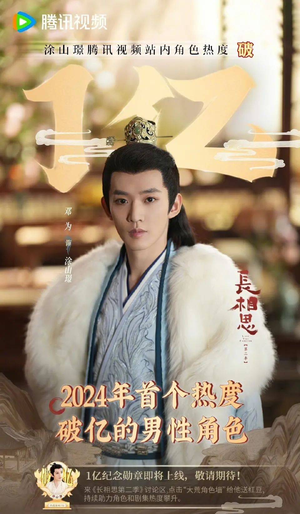 《长相思2》终于完结了,这部剧的话题、讨论度都有,但基本上都是骂剧情魔改,还有就是各家CP粉撕X,打架打到昏天暗地无人护剧,所以导致它作为爆款续作,拿到的成绩很可惜。但这部剧最大的红利,确实是让邓为吃到了,线上角色热度排第一,本人7天涨粉100万 ,壁了檀健次、张晚意,而且粉丝多,数据女工含量还高,根据最新战报,涂山璟已经是2024年腾讯站内第一个热度破亿的男性角色,目前已经破3亿了!