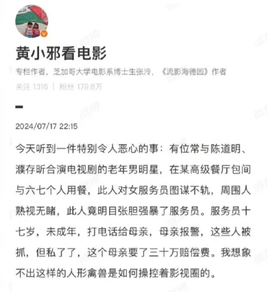据圈内人士爆料,某老年男明星,在高级餐厅的包间里性侵了一名女服务员,而包间里的其他人却熟视无睹,仿佛什么事情都没发生一样。更离谱的是,这个被性侵的女服务员只有17岁!她的母亲在得知此事后愤怒报警,但双方最终却选择了私了。这个男明星给了女方家30万,就简单粗暴地解决了这件事。这位男明星还经常和陈道明,濮存晰一起合作。随后这件事上了热搜,引发网友热议。评论区网友也是纷纷猜测这个老年男明星到底是谁,目前呼声最高的就是高亚麟!