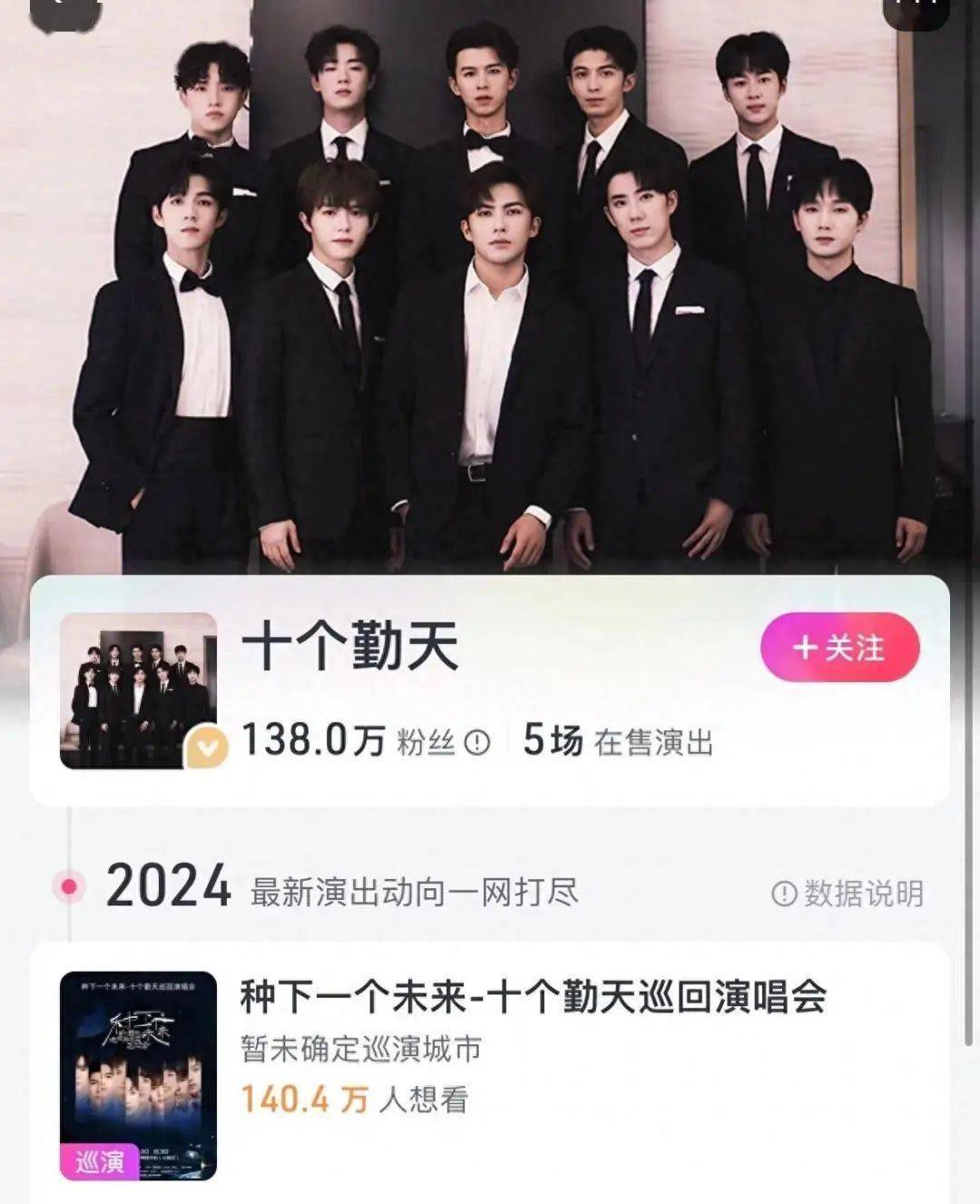 目前,“十个勤天”演唱会已经在杭州、北京举办5场,门票定价为388元-1588元,每场近万张门票均瞬间售罄,总营收数千万元。目前,光杭州站就有47.5万人在大麦标记想看,并且未来还计划在其他城市举办。