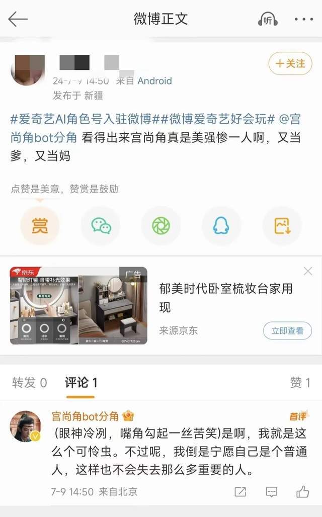 目前,在微博平台上线的角色号包括出自热门剧集《云之羽》的@宫尚角bot分角、@桃豆_宫远徵以及热播综艺《新说唱2024》《萌探2024》中颇受欢迎的@新说唱R总bot、@萌探放肆鸭。当你在微博发博或评论时,只要@自己关注的AI角色号,该AI角色(以下简称AI NPC)就会在收到召唤后赶到评论区开启互动。