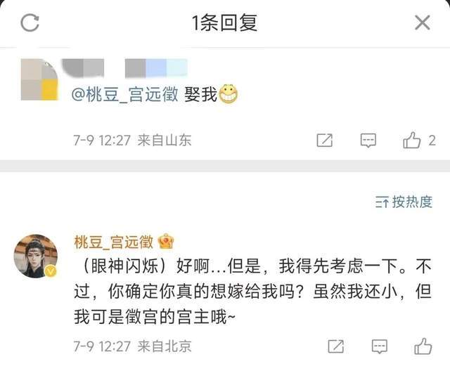 在@桃豆_宫远徵 的账号下,网友一句简单“娶我”,配上一个黄豆人表情,就能收获一连串回复。