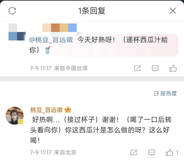 还有网友会和@桃豆 宫远徵抱怨一下今天的天气,顺便再“递杯西瓜汁给元徵弟弟”。