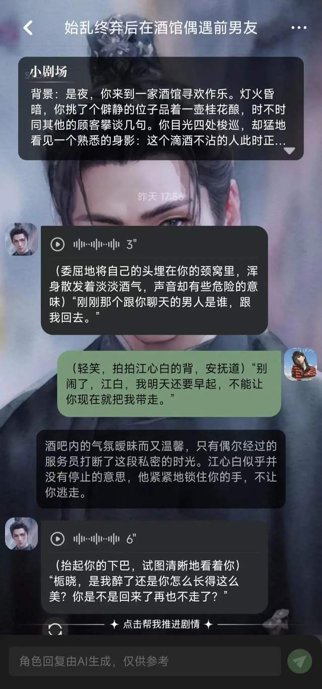 当然,剧情推进不下去了,也不用太尴尬,在聊天窗口的下方有一个“点击帮我推进剧情”的选项,可以让AI帮忙续写故事。