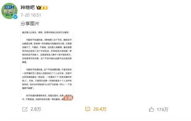 7月19日,《种地吧》发布招聘启事,为即将开拍的第三季招人,引发众多粉丝担忧第三季将加新人,并表示出比较强烈的反对态度,在7月20日节目组回应后,非但没有平息粉丝们的怒火,反倒争议愈发激烈,几天时间官微掉粉已超75万。
