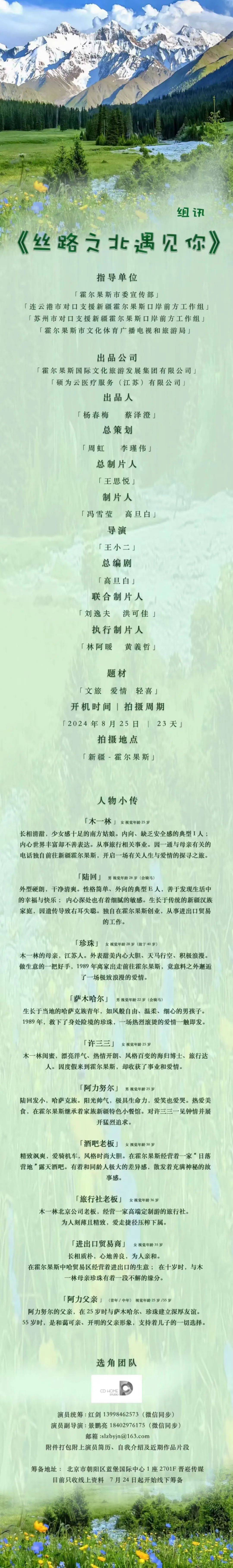 免责声明:戏客Seeker公众号(“本平台”)中全网组讯的信息、内容(“组讯信息”,包括但不限于影视项目名称、项目介绍信息、出品公司信息、导演信息、选角团队信息、拍摄相关信息、联系方式等)均来源于内容信息相关方提供或互联网公开信息。本平台不对组讯信息的真实性、准确性、完整性、及时性、关联性、适用性及安全性提供任何明示或默示的担保。请您谨慎参考或使用组讯信息,并确保您的人身、财产安全,本平台不对您使用或参考组讯信息而造成的后果承担任何责任。