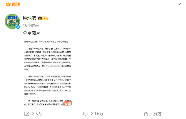 原来,《种地吧》这档综艺节目,经过两季的发展之后,获得了非常不错的观众口碑和市场反馈数据,因此,节目组发出公告,在全国范围内,征集争夺的愿意来种地的且有经验的青年。这则公告,被不少《种地吧》的忠实观众和忠实粉丝们解读为:节目组要卸磨杀驴了,要遣散节目当中种地的十位青年了,要换平台方的太子们来了。