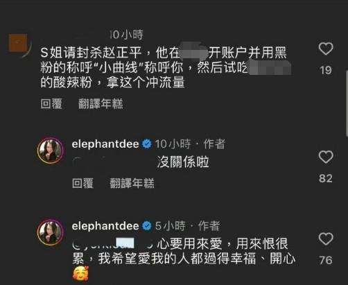 此前,有网友去小S社交账号下留言称赵正平用黑粉的称呼“小曲线”来称呼她,对此,小S回应道:“没关系啦!心要用来爱,用来恨很累,我希望爱我的人都过得幸福、开心。”