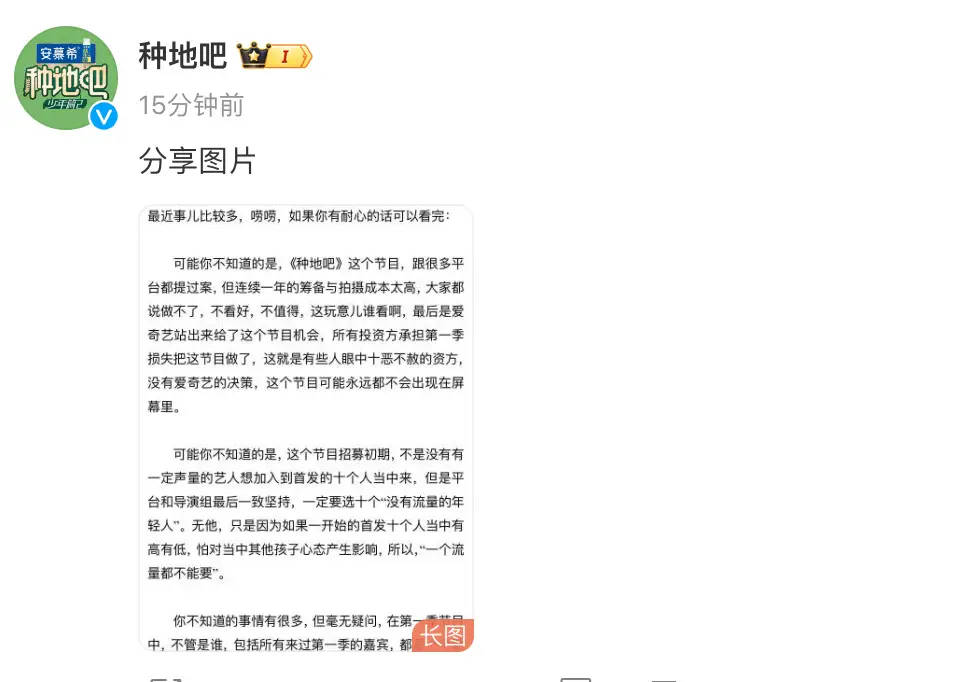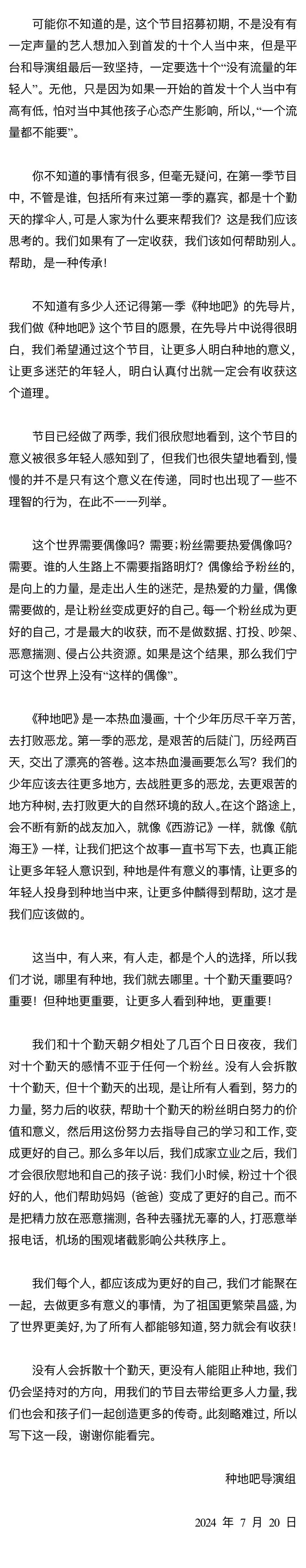 搜狐娱乐讯 20日,《种地吧》导演组回应网传第三季换人或加新人传闻:“没有人会拆散十个勤天,更没有人能阻止种地,我们仍会坚持对的方向,用我们的节目去带给更多人力量,我们也会和孩子们一起创造更多的传奇。”