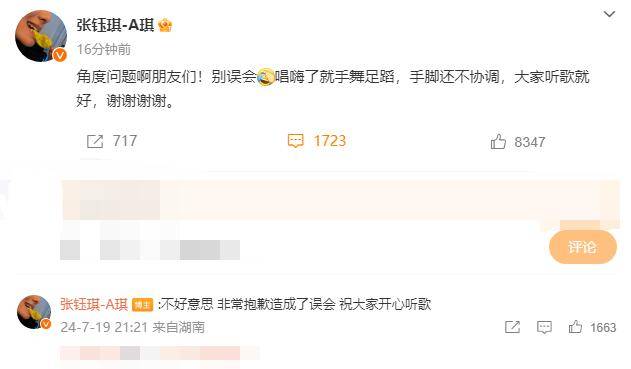 随后,张钰琪又在评论区道歉:“不好意思,非常抱歉造成了误会,祝大家开心听歌。”