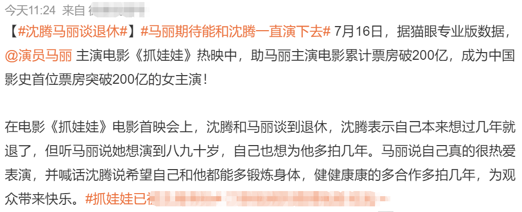 在宣传《抓娃娃》期间,马丽和沈腾聊到了退休的话题,沈腾表示自己本来想过几年就退休了,马丽则表示自己还想拍到八九十岁呢。