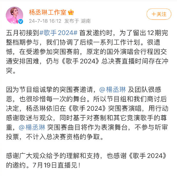 搜狐娱乐讯 7月18日,杨丞琳工作室发文回应了杨丞琳重返《歌手》舞台一事,杨丞琳方表示由于行程冲突不能参与歌手2024总决赛,因此杨丞琳的突围赛演出将为表演舞台,不参与听审投票,不计入总决赛资格争取。