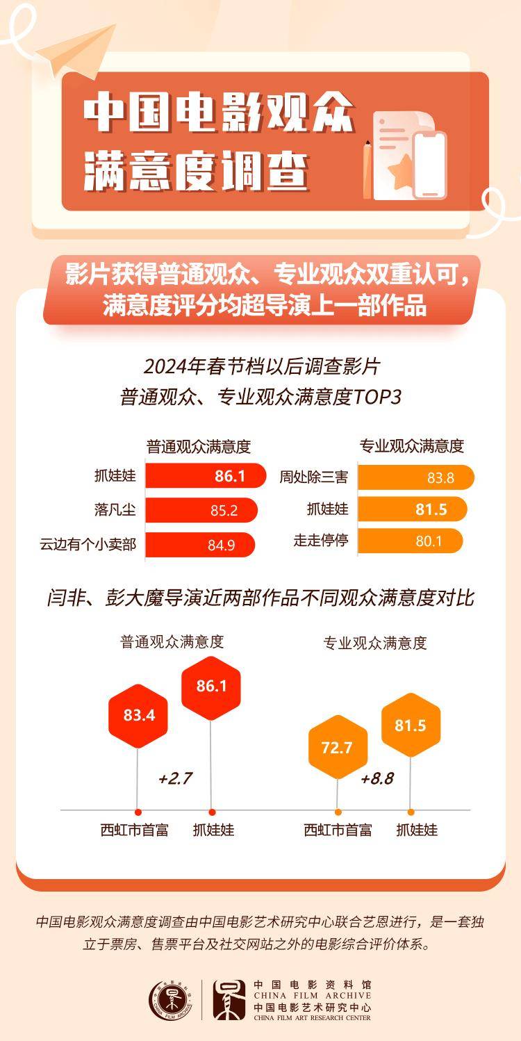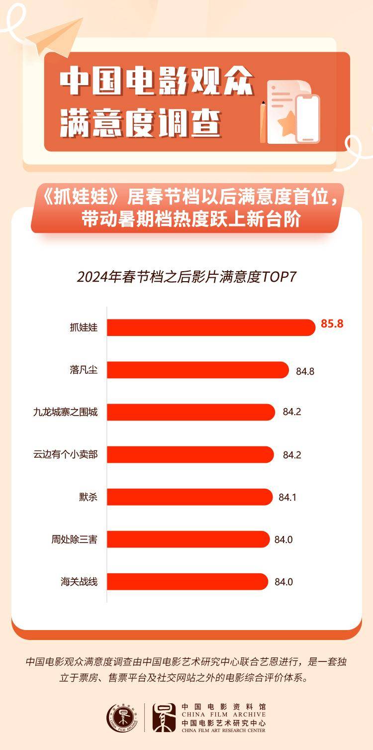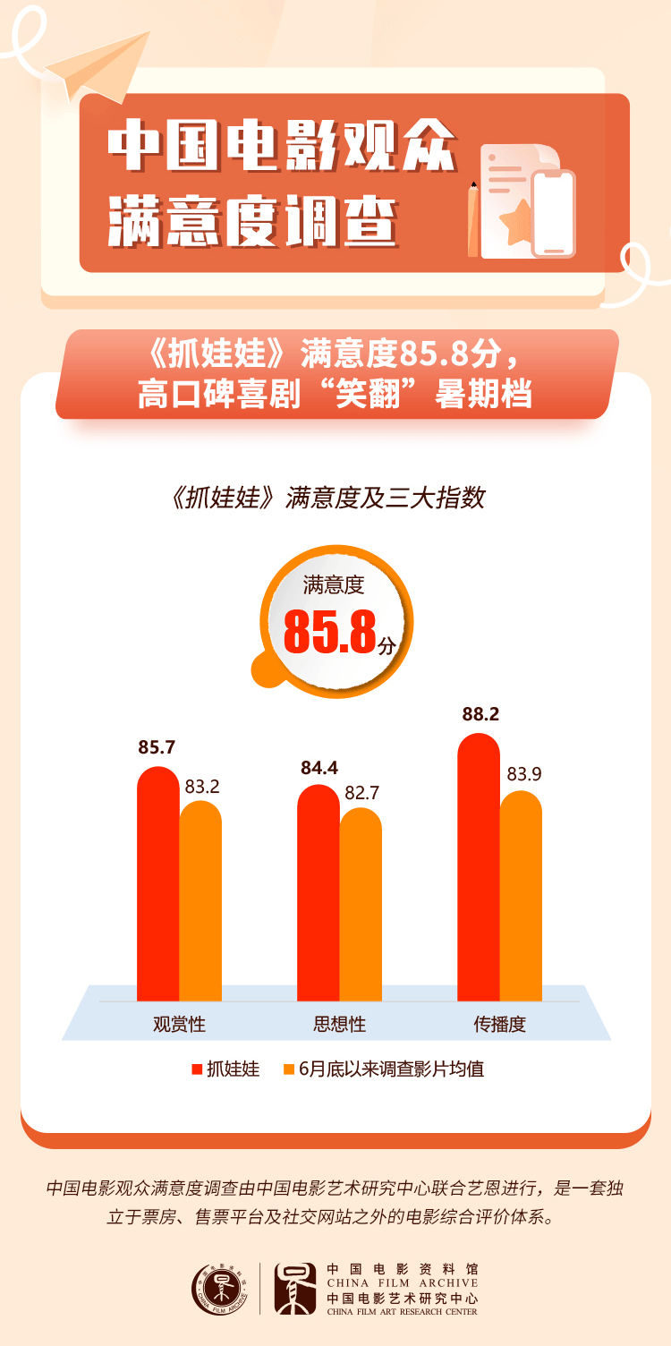 中国电影观众满意度调查显示,《抓娃娃》满意度居截止目前暑期档第一位,同时也是春节档之后观众最满意影片。影片优质创作和受欢迎主创相得益彰,满意度及票房双高强势提振市场信心,暑期档热烈观影氛围有望持续。