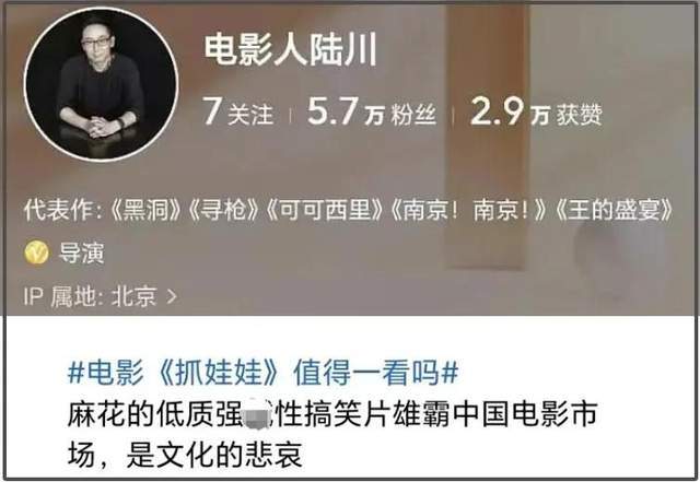 他在某平台的账号带电影《抓娃娃》话题,并点评称:“麻花的低质XX性搞笑片称霸中国电影市场,是文化的悲哀。”紧接着秒删了这条评论。