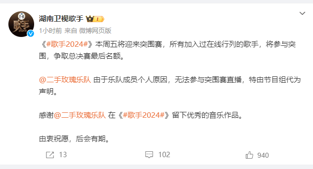 搜狐娱乐讯 7月17日,《歌手2024》节目组代二手玫瑰发声明:“由于乐队成员个人原因,无法参与突围赛直播,特由节目组代为声明。感谢二手玫瑰乐队 在《歌手2024》留下优秀的音乐作品。由衷祝愿,后会有期。 ”