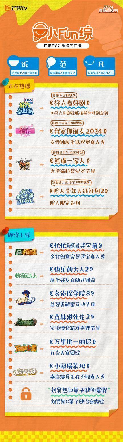 作为会员定制综艺厂牌,“小Fun综”以用户需求为出发点,以“Fun”为内核,融合了娱乐性、陪伴感与创意性。“陪伴每个人的下饭时刻”、“聚焦年轻人的圈层文化”、“挖掘普通人的不凡人生”是芒果TV对其“小Fun综”的核心创作理念。伴随着厂牌正式官宣,芒果TV一次性发布了11档“小Fun综”综艺节目,不仅预示着会员专属内容的创作的全新升级,也标志着芒果TV在综艺领域商业模式的又一次创新探索。