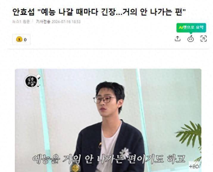 对于,韩国知名男星,演员安孝燮,透露每次上综艺节目都会紧张,大汗淋漓亮相引起韩国网友关注,大家怎么看呢?