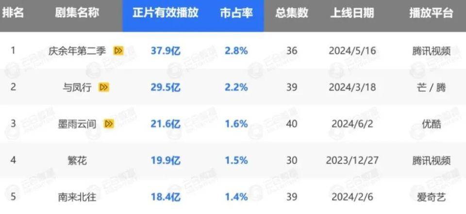 云合数据显示,《庆余年第二季》在2024H1以累计正片有效播放37.9亿实现领跑,《与凤行》和《墨雨云间》则分别位居2024上半年全网剧集有效播放霸屏榜第二、三位。