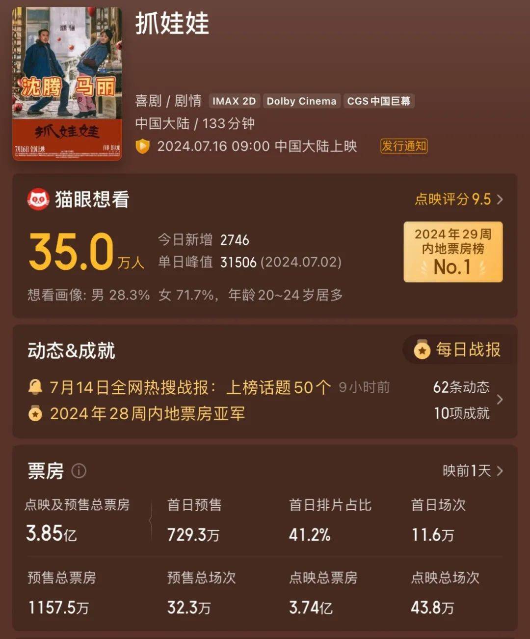 纯喜剧设定,沈腾马丽不“卡司诈骗”的绝对主角复出,开心麻花大礼包,乘上马丽回归《西虹市首富》重拍的热度,《抓娃娃》占据了暑期档大多数的爆点。