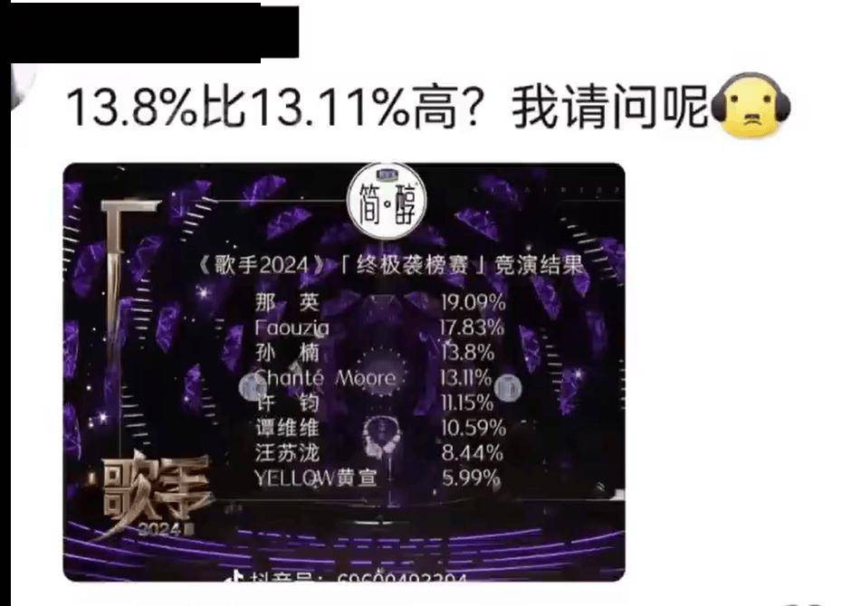 孙楠得票13.8%,外国歌手香缇莫得票13.11%。