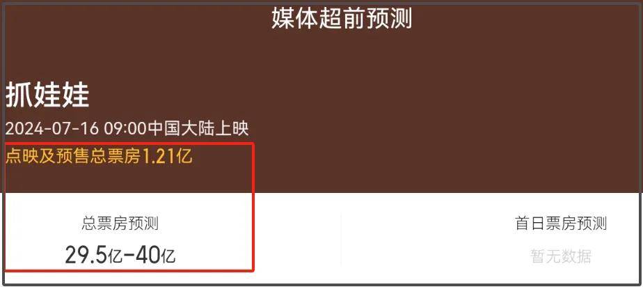 从《抓娃娃》目前票房走势,点映效果相当不错,各大平台预测票房直冲30亿,甚至有媒体预测《抓娃娃》最终票房有望达到40亿,直接预定了暑假档票房冠军位置。