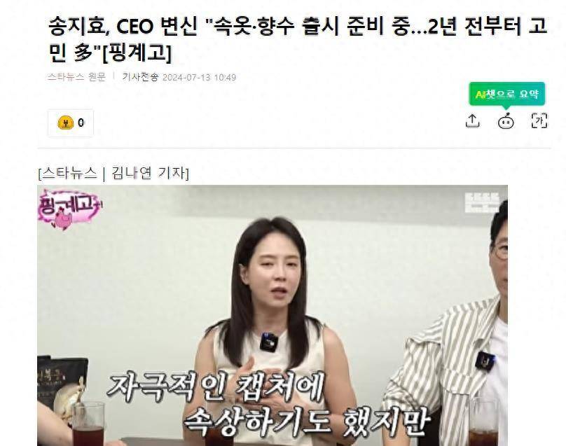 韩国知名女星,演员宋智孝,宣布成为CEO,两年前就和刘在石讨论过。