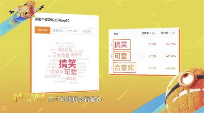 纵观观众的评论,提及的热词中排名前三十位的,能够看到有“搞笑”“可爱”“合家欢”三个词语比重最高。作为陪伴小朋友去看《神偷奶爸4》的大朋友来说,麻宁觉得非常好笑,笑点很密集。