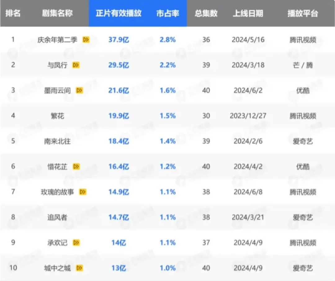 头部大剧《庆余年第二季》《与凤行》《繁花》强势领跑,《墨雨云间》《玫瑰的故事》《南来北往》引起全平台追剧热潮,《追风者》《城中之城》等严肃题材同样收获不俗成绩。
