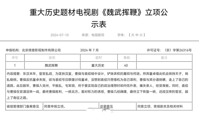 7月11日,一部刚刚立项的电视剧,竟然火爆互联网。它便是刚刚立项公示的重大历史题材的电视剧《魏武挥鞭》。大家不妨先来看这部电视剧的立项剧情梗概: