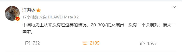 搜狐娱乐讯 7月10日,编剧汪海林发文吐槽年轻女演员:“中国历史上从来没有过这样的情况,20-30岁的女演员,没有一个会演戏,偌大一国家。 ”随后还在评论区留言补充:“也许有,但屏幕上荧幕上没有。”