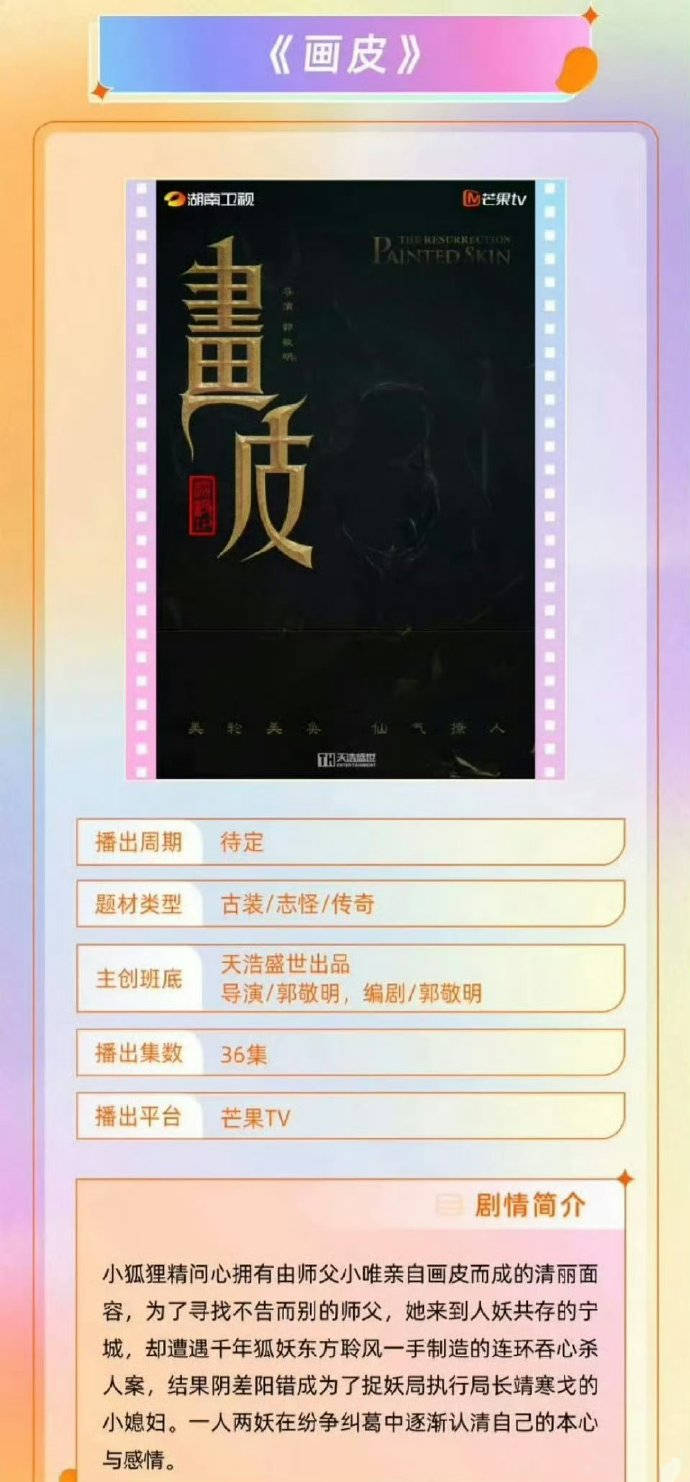 7月10日,电视剧版《画皮》曝出了一些物料内容。这些资料显示,该剧由郭敬明编剧并且执导,36集的剧情,芒果TV播出,同时,该剧是双女主的戏码,两位女主角分别是鞠婧祎和陈都灵。据悉,该剧会在今年11月份正式拍摄,2025年与观众见面。