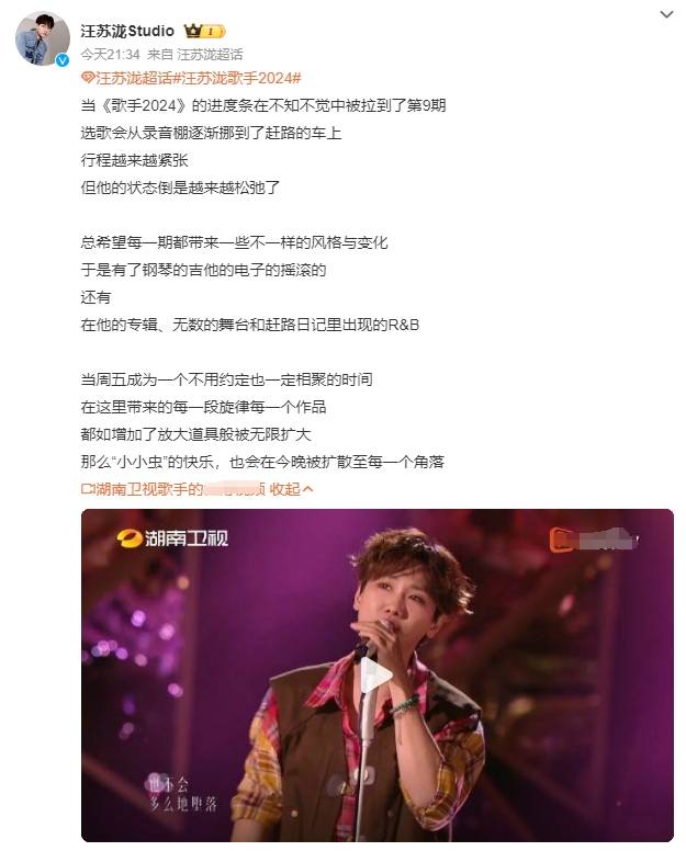 搜狐娱乐讯 7月5日,汪苏泷在最新一期《歌手》演唱结束后,汪苏泷工作室发文回应了汪苏泷的近期比赛状态,“行程越来越紧张,但他的状态倒是越来越松弛了”