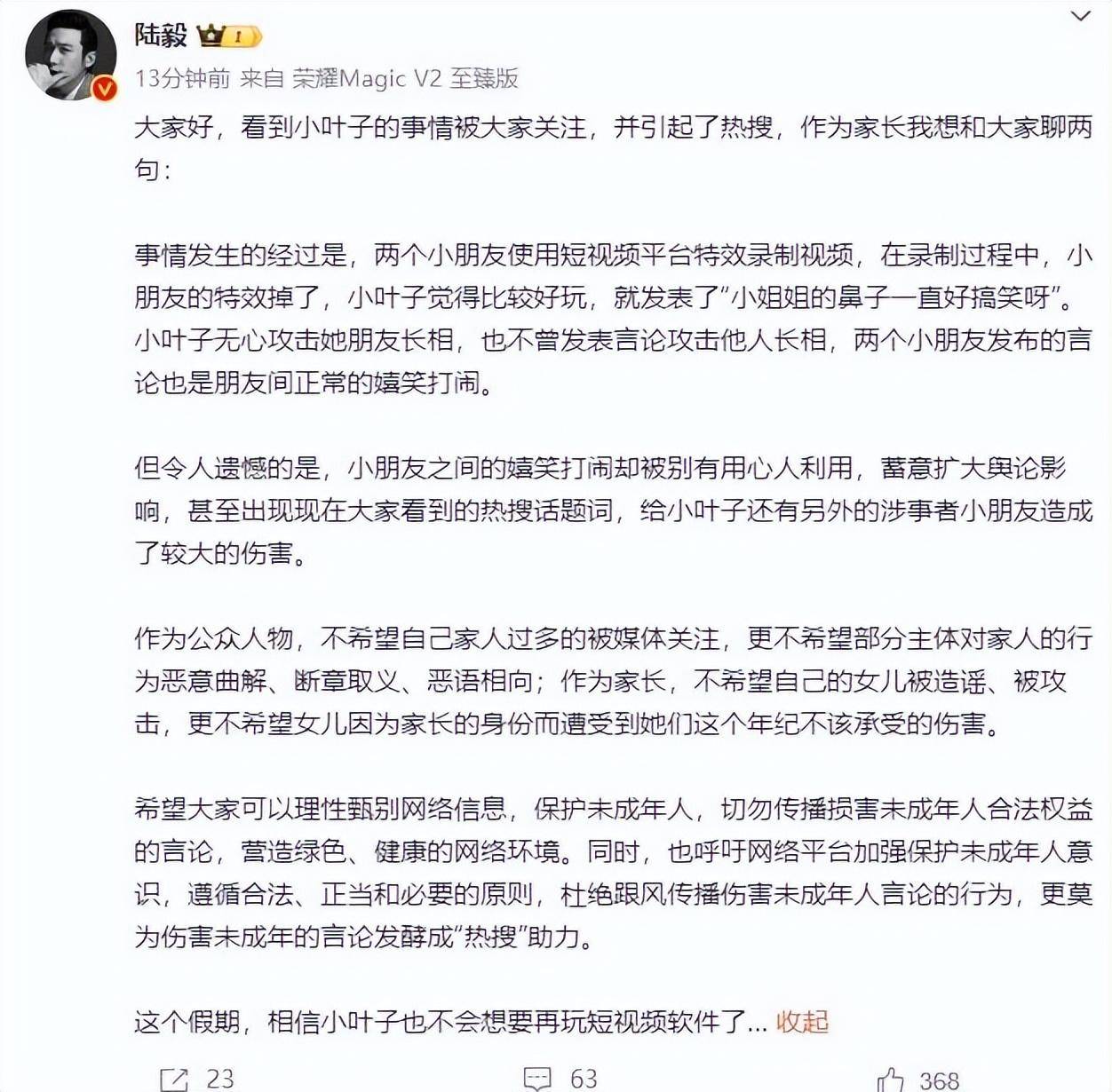 陆毅一看,这哪行啊!自己的女儿被这样造谣,他能不心疼吗?于是,他就在个人社交账号上发了一篇长文,把事情的来龙去脉都说清楚了。他说,小叶子只是觉得特效掉了很有趣,并没有嘲笑别人的意思。他还说,这个事件对两个小朋友都造成了很大的影响,小叶子这个暑假都不想再玩短视频软件了。