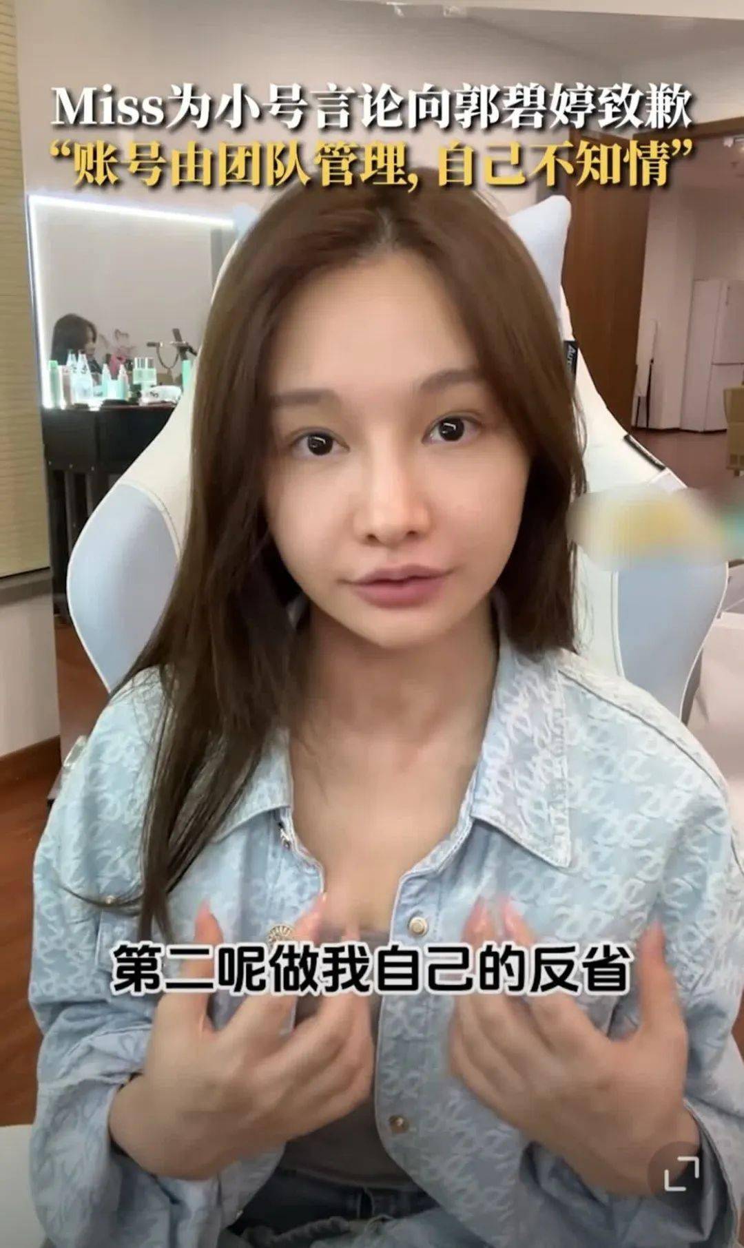 7月2日,韩懿莹发视频向郭碧婷致歉,表示自己近日里每天大多时间都在打游戏,只睡4个多小时,期间屏蔽了很多媒体信息,自己有太多的自媒体账号,而这些账号不完全由自己管理,大多账号由团队在管理,因此对此事完全不知情,这属于“团队的谜之操作”。在评论区看到网友讨论才得知这件事,第一时间向郭碧婷表达了歉意,个人也进行了反思。